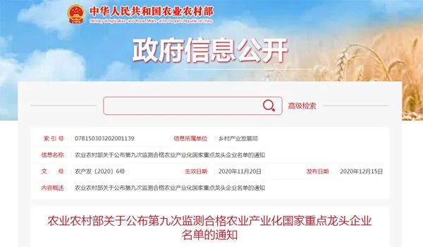12月15日,農(nóng)業(yè)農(nóng)村部發(fā)布《關(guān)于公布第九次監(jiān)測(cè)合格農(nóng)業(yè)產(chǎn)業(yè)化國(guó)家重點(diǎn)龍頭企業(yè)名單的通知》。